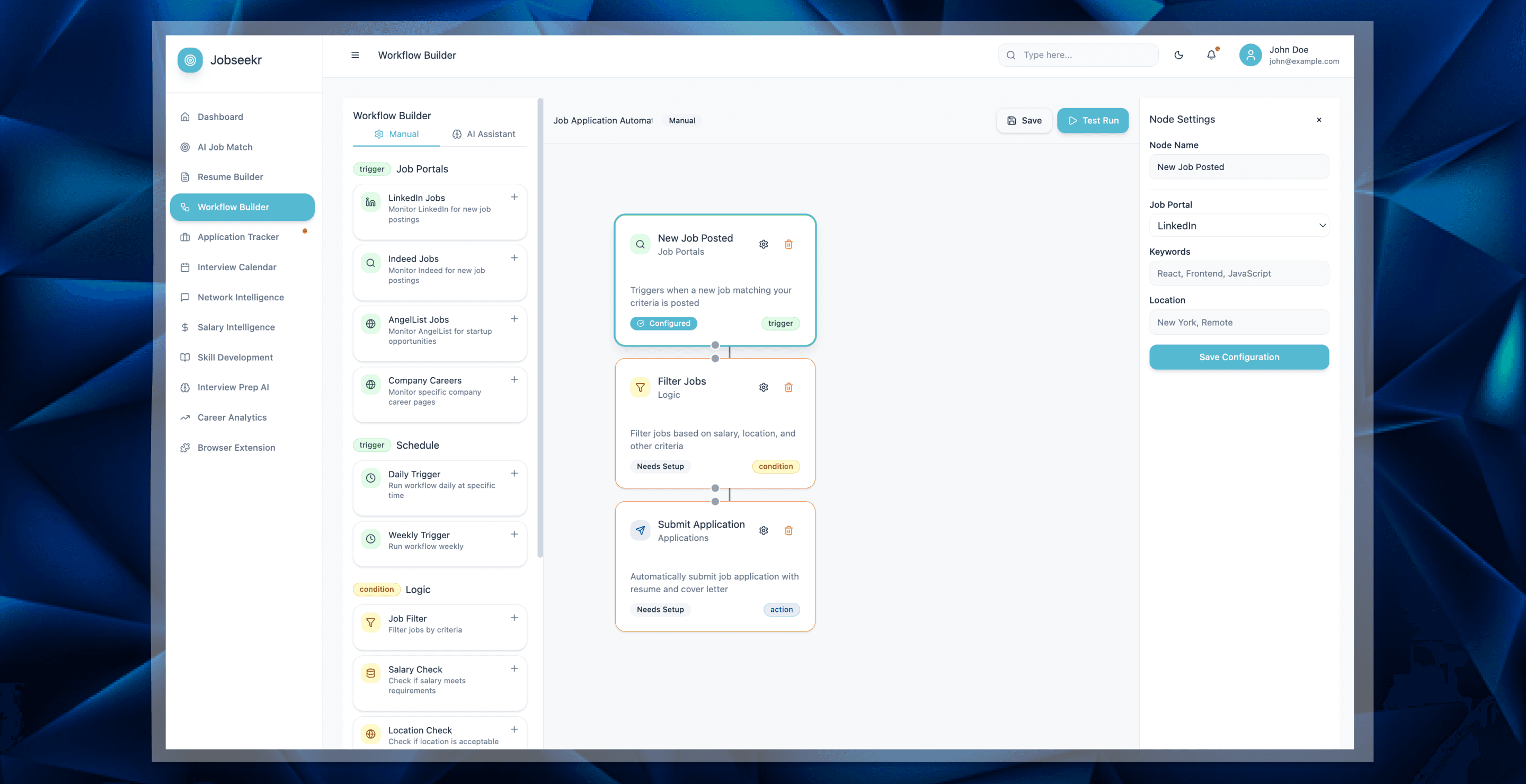 The platform was designed as a modular, AI-driven system that automates job discovery, application execution, and continuous optimization.